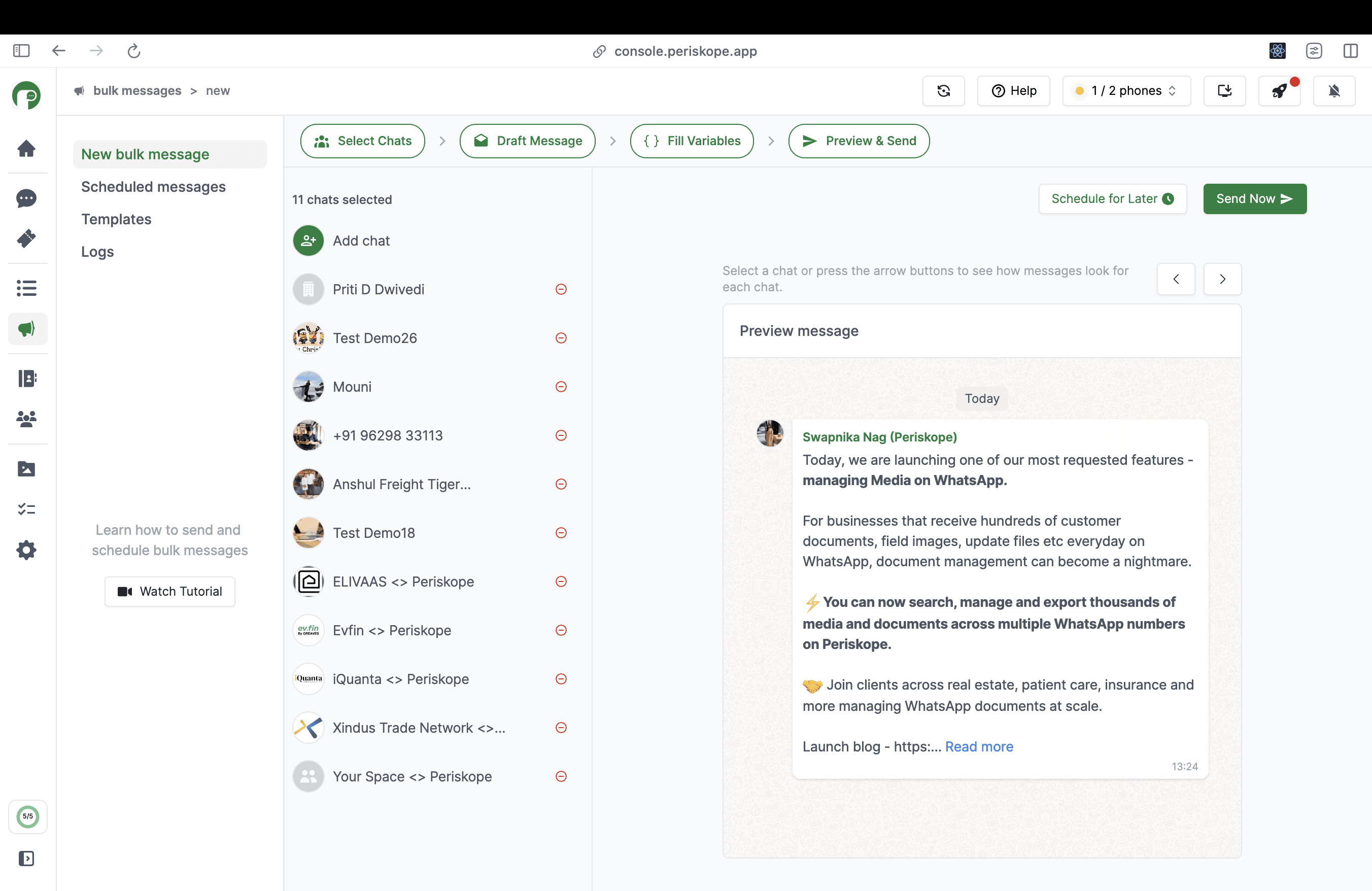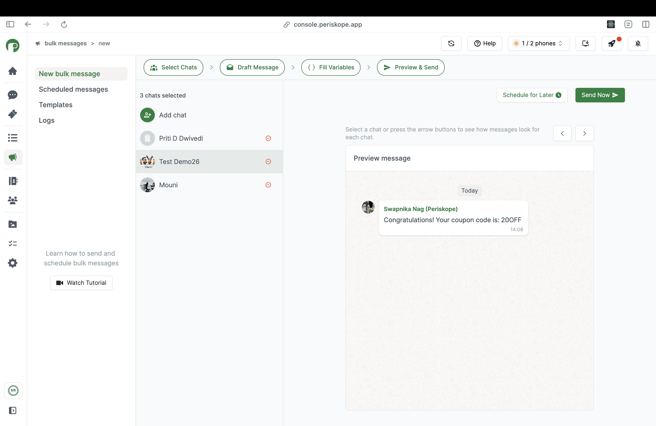 Send or Schedule Messages: Once you are happy with the preview, click on ‘Send now’ to send immediately and ‘Schedule for later’ to schedule the message for a later date and time.