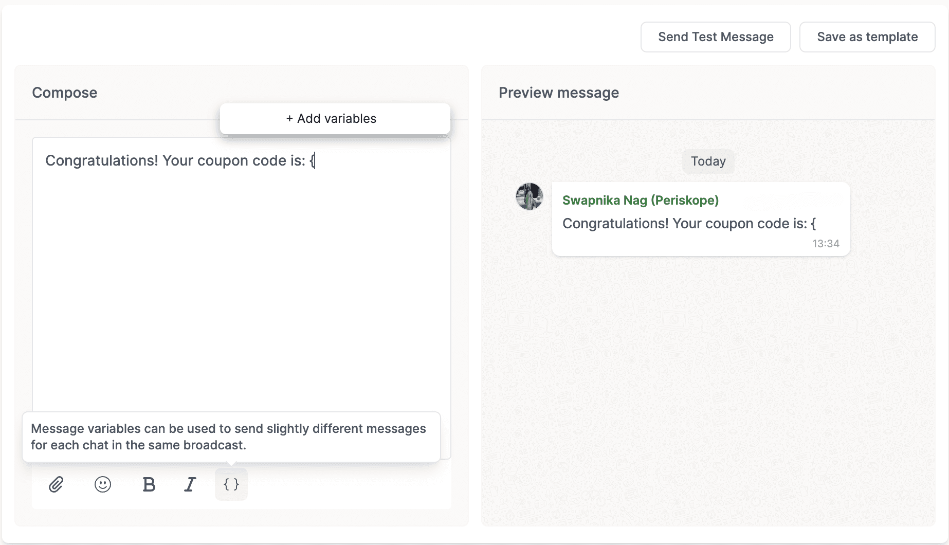 Preview Messages: When you preview the message, it will show examples of how the variables will be replaced with actual data. Click through the chats to see how each message will look.