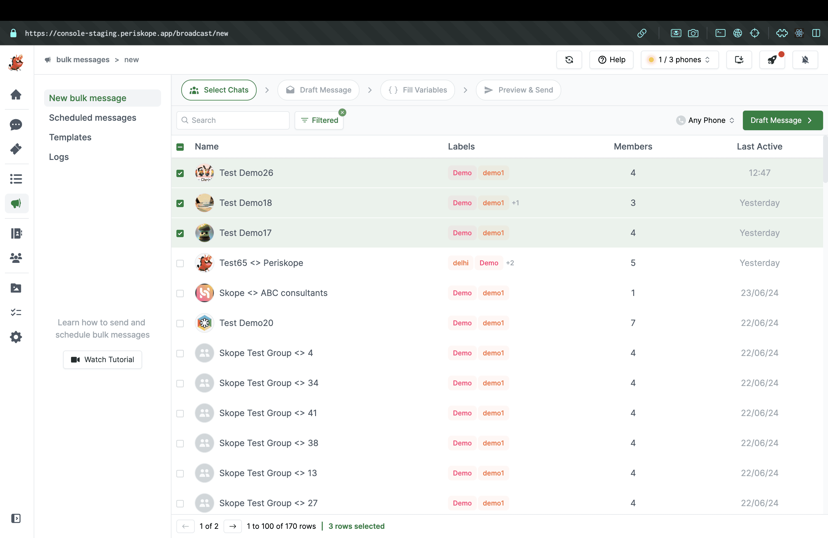 Select Groups: Navigate to `Bulk messages > New bulk message`, select the groups from the table and click on 'Draft message' on the top right.