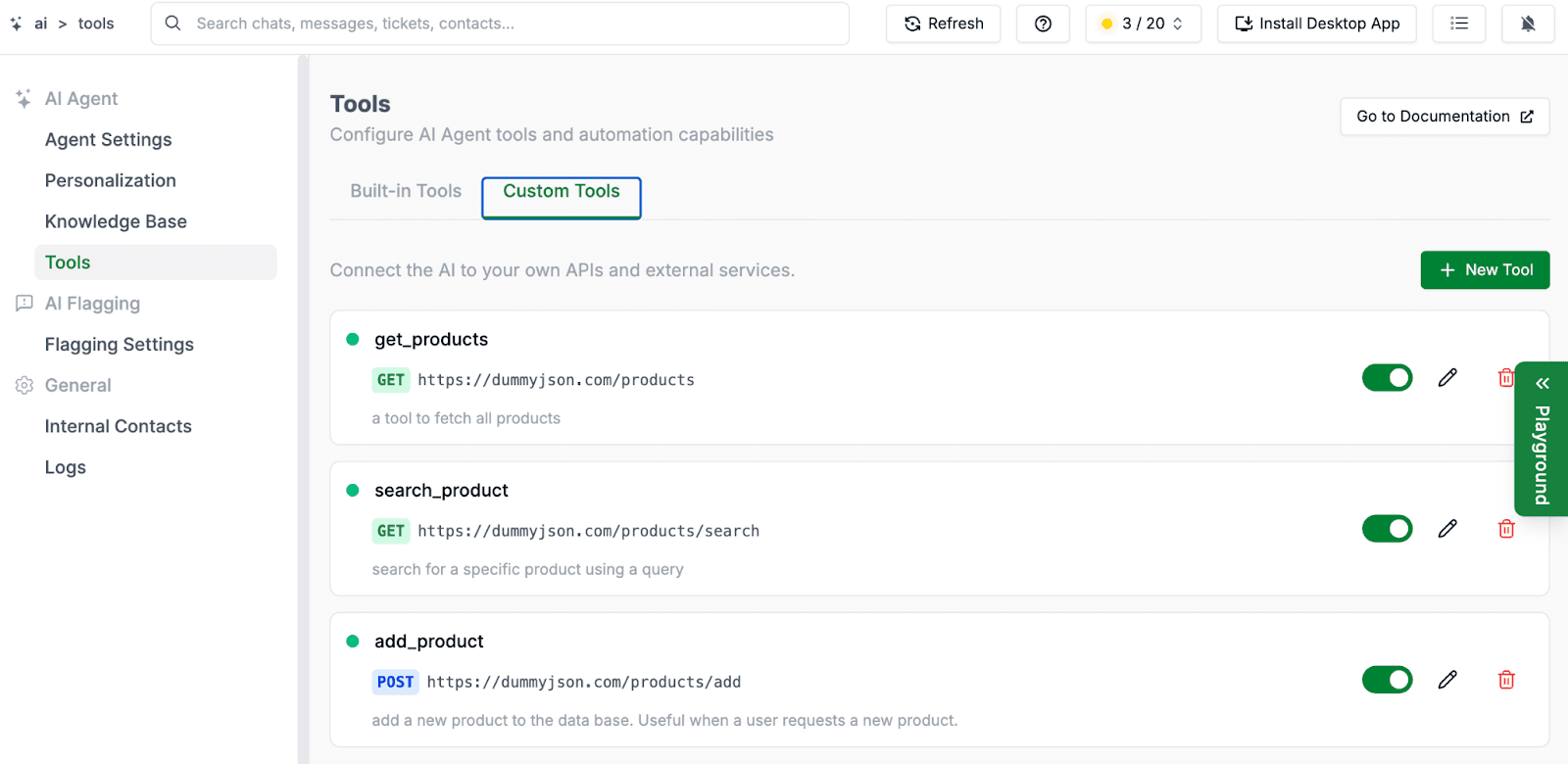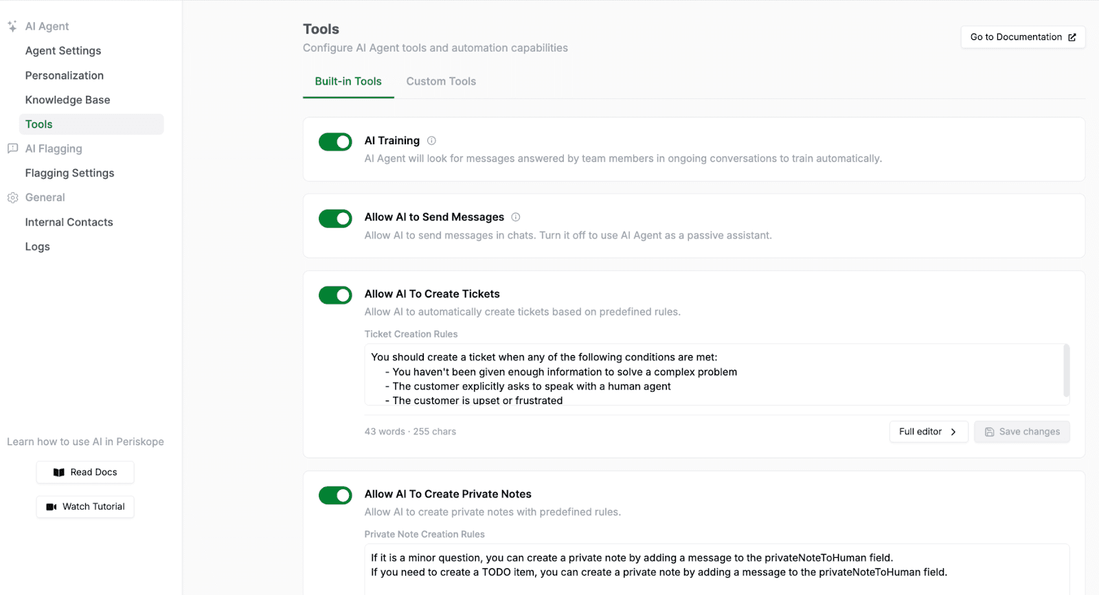 Now you can set it up exactly the way your team operates. Head to AI > Tools > Built-in Tools to configure these.