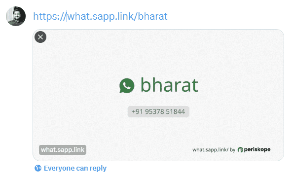 Every link generated with what.sapp.link comes with an autogenerated open-graph image. So when you share it publicly, the link will automatically show a preview of your name and number